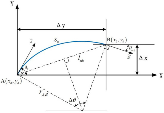 We set up a coordinate system by taking the segment of the deformed curve arc, as shown in Figure 4. The starting point of the curve coincides with the origin of the coordinate, where and are tangent vectors of points and , respectively; and are tangent vectors of points and , respectively, at the positive angle to the X-axis, is the arc length of the curve arc, is the chord length of the arc, and is the central angle of the arc . For point , the coordinate increment of point is .