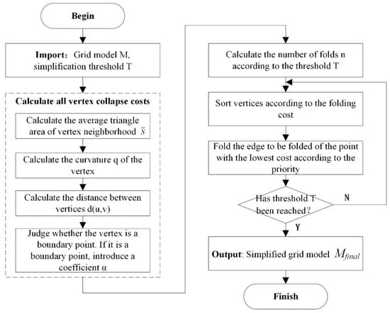 Based on the above analysis, an edge-based collapse cost calculation method was chosen. Considering the average area, curvature and distance of the triangle in the vertex neighborhood of the mesh, the boundary point factor was introduced to ensure the overall structure of the mesh model and simplify the 3D mesh model. The specific steps of the process are described in Figure 6.