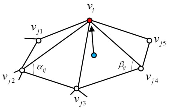 where represents all vertices that can form an edge with vertex , i.e., neighborhood vertices; is vertex relative to and . For calculating the weights , we selected the cotangent weight equation as