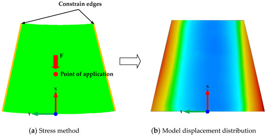 In order to verify the deformation effect of the deformation algorithm in this paper, the deformation effect was verified by a 3D surface with unequal curvature of 400 mm × 300 mm (in length and width). As shown in Figure 9, the unequal curvature model was placed horizontally, and its two long edges were constrained in the Z direction, so that it can only move in the X and Y directions. At the same time, the unequal curvature model was subjected to a unilateral local load of 50 N, and the stress direction and position are shown in Figure 9a. The displacement distribution results of the model after stress were shown in Figure 9b, where the blue area was the inward contraction of the deformed model relative to the original model at its normal position, and the red area was the outward expansion of the deformed model relative to the original model at its normal position. The number of triangles of the original surface was 773,465, and the number of vertices was 387,517. Thirty points were uniformly selected as control points on the deformed surface to verify the accuracy of the deformation algorithm.