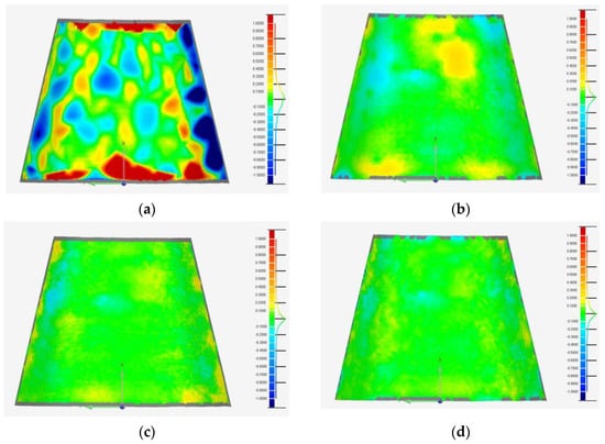Comparison of deviation between the deformed mesh algorithm and actual deformed model: (a) Interpolation algorithm; (b) Gaussian fusion; (c) Laplace; and (d) HEC−Laplace.