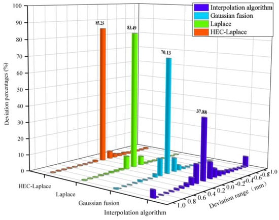 To verify the accuracy of the HEC−Laplace algorithm, based on the original surface and deformed control points, 3D deformation mapping of the above surface was carried out by the interpolation, Gaussian fusion, Laplace, and optimized Laplace algorithms. The deviation consistency between the mapped and actual deformed surfaces was detected, and the deformation accuracy after the mapping of the above four algorithms was analyzed, as shown in Figure 10. Here, Figure 10a shows the consistency detection result of the interpolation algorithm, 10b shows the consistency detection result of the Gaussian fusion algorithm, 10c shows the consistency detection result of the Laplace algorithm, and 10d shows the consistency detection result of the optimized Laplace algorithm. Furthermore, the right-hand side of the figure shows the deviation chromatogram of the histogram. To make the result clearer, we set the red range, as the mapping surface was higher than the actual deformation surface in the normal direction. The blue range shows that the mapping surface was lower than the actual deformation surface in the normal direction, and the green part shows that the deviation range was within the range of [−0.1, 0.1]. It can be clearly seen from the figure that the Laplace algorithm is significantly superior to the interpolation and Gaussian-fusion algorithms. To further analyze the accuracy of the deformation algorithm, the consistency results of the above four algorithms were statistically analyzed for the percentage of deviation. The results are shown in Figure 11. It can be seen from the figure that within the range of [−0.1, 0.1], the percentage of point clouds of the interpolation algorithm is 37.88%, the percentage of point clouds of the Gaussian fusion algorithm is 70.13%, the percentage of point clouds of the Laplace algorithm is 83.49%, and the percentage of point clouds of the HEC-Laplace algorithm is 85.25%.