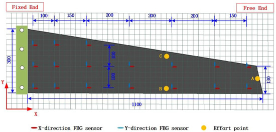 The optical fiber distribution of the wing model is shown in Figure 14. The sensor network consisted of 34 fiber-grating strain sensors; each of them is a pair that is arranged orthogonally to generate 17 measurement nodes. In the figure, the red sensor is the X-direction strain monitoring point, and the blue sensor is the Y-direction strain monitoring point. Among them, points A, B, and C are the force application points, which are located at different positions of the wing tip. We also verified the deformation of the wing model under different loads. The results of five different load application methods are presented in Table 2.