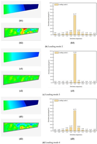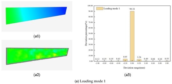 The shape variables of the wing, the amount of deviation between the reconstructed and actual models, and the percentage of deviation distribution at each deformation under the above five loading conditions are shown in Figure 15. Among them, Figure 15(a1–e1) shows the results of the shape variables of the wing model under the above five loading modes, Figure 15(a2–e2) shows the results of the deviation consistency test between the reconstructed model and the actual wing point cloud data measured by binocular under the above five loading modes, and Figure 15(a3–e3) shows the percentage of the deviation result point cloud distribution under the above five loading modes.