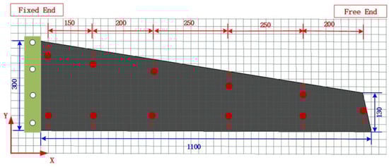 Simplified wing geometry and optical fiber distribution (unit: mm).