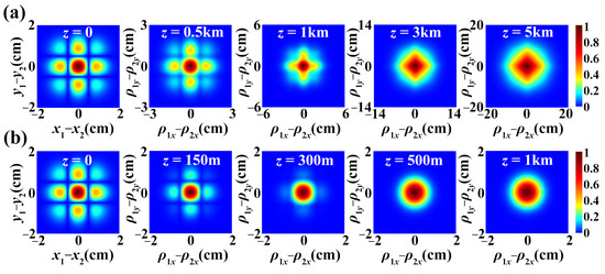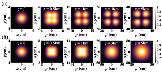 The evolution of the SSS beam propagating in free space, in terms of intensity, is shown in Figure 2a. It displays normalized density plots of the transverse spectral intensity for various propagation distances. As the propagation distance grows, it is clearly observable that four beam spots eventually develop from the original single beam spot while propagating, i.e., the SSS beam displays splitting characteristics as it travels. Figure 2b depicts how the spectral intensity changes over time in oceanic turbulence. The fact that such a beam still seems to exhibit splitting properties is shown when propagating over a short distance, while the intensity distribution of the spectra steadily develops into a Gaussian form over longer distances. This is due to the fact that, when the propagation distance is low, the beam’s free-space diffraction dominates, whereas the isotropic effect of oceanic turbulence progressively builds up and dominates as the propagation distance grows.