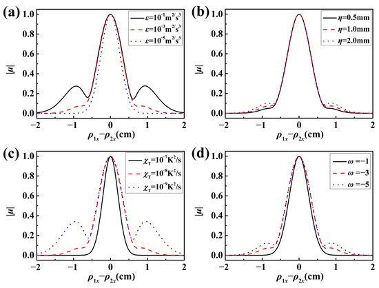 Cross line () of the SDOC modulus at a propagation distance of z = 300 m for various oceanic turbulence parameters: (a) the kinetic energy dissipation rate per unit mass of the fluid; (b) the Kolmogorov inner scale; (c) the dissipation rate of the mean-square temperature; (d) the relative strength of the temperature to salinity undulations.