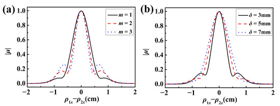 Figure 3 illustrates the SDOC modulus of the SSS beam for a propagation distance of z = 300 m, while assuming various oceanic turbulence parameters. On the SDOC degradation in oceanic turbulence, the impacts of different dissipation rate values for the kinetic energy per unit mass of the fluid are compared in Figure 3a. The SDOC distribution in oceanic turbulence exhibits side robes when the kinetic energy dissipation rate per unit mass of the fluid takes a high value, and it degenerates more quickly to a Gaussian form as the dissipation rate drops. Thus, it may be concluded that the development of the spectral degree of coherence of the SSS beam is significantly harmed by oceanic turbulence, which has a low kinetic energy dissipation rate per unit mass of the fluid. The slower degradation of SDOC can be attributed to reduced oceanic turbulence, which is caused by the faster dissipation rate of kinetic energy per unit mass of fluid. With a similar analysis, the following conclusions are drawn from Figure 3b–d. The oceanic turbulence containing a small Kolmogorov inner scale, alternatively with an extensive dissipation rate for the mean-square temperature or with a substantial relative strength for the temperature to salinity undulations, has a sizeable negative effect on the SSS beam from the perspective of the degeneration of the SDOC. It makes sense that the significant light scattering will be caused by the smaller inner scale of turbulence. As the light scattering increases, the degeneration of the SDOC caused by oceanic turbulence increases. The more energetic turbulence is often determined by the mean-squared temperature dissipation rate, which leads to enhanced SDOC degeneration. Regarding the case, the temperature and salinity undulations’ relative strength −5, the temperature field’s volatility dominates. Whereas when 0, the fluctuation of the salinity field is dominant. This suggests that the deterioration of the SDOC of the SSS beams is greatly influenced by the salinity fluctuations in comparison to the temperature fluctuations. Therefore, the SSS beams propagating in deep-sea regions can maintain the beam performance better in shallow-sea regions.
