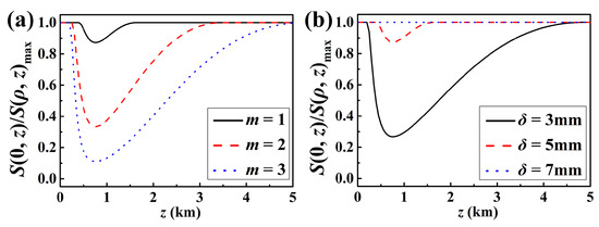 To fully persuade readers that the SSS beam with large beam order and low coherence propose greater turbulence resistance, we search for more angles to examine the effects of beam order and coherence length on turbulence resistance. The normalized propagation factor for SSS beams traveling through oceanic turbulence for various beam orders and coherence lengths is shown in Figure 7 as it changes over time. As a control group, we also show the normalized propagation factor for Gaussian Schell-model (GSM) beam (w = 1 cm, = 5 mm) under the same turbulence parameters. GSM beam is well-known and simple partially coherent beam, and there are many studies on its propagation properties. In Ref. [31], it is confirmed that such beam can be evaluated oceanic turbulent optical wireless communication performance from the perspective of the beam wander. From Figure 7a, it can be shown that the beam order has a substantial impact on the variance of the propagation factor in turbulence. This variation grows more quickly with lower beam order, suggesting that a higher-order SSS beam is less altered by turbulence. Additionally, from Figure 7b it is determined that the coherence length has a substantial impact on the propagation factor, i.e., SSS beams containing a low coherence have reduced propagation factors. As a result, we draw the conclusion from Figure 7 that higher-order SSS beams with low coherence are less susceptible to turbulence and have superior resistance to oceanic turbulence when accounting for the propagation factor. Furthermore, we noticed that the normalized propagation factor of the GSM beam increases faster than that of the SSS beam on propagation, which means that the SSS beam modulated by the coherence structure can effectively mitigate the negative effects of turbulence.