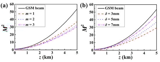 This variable correlates with the beam propagation factor . Taking a certain beam width at the source plane, lower beam divergence, and the correspondingly reduced are related to improved beam quality. Next, we consider the propagation factors that align with the x- and y-directions, due to the beam being rectangularly symmetric. Substituting Equations (23) into Equation (24), we obtain an explicit expression for the propagation factor of the SSS beams in the oceanic turbulence.