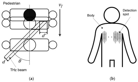 For the detection spot to cover the entire inspection area with this method, it should be scanned vertically at a faster speed than the walking speed. Specifically, the time required to vertically scan the detection spot () should be shorter than that required for the detection spot to move horizontally by the width of the diameter of the spot () owing to walking. Therefore, when the diameter of the detection spot is , the detection spot diameter at the human body surface is , the angle of incidence is , and walking speed is ,