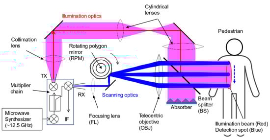 Next, the actual optics of the body scanner system is described. The Tx signal was used as an illumination beam to the target, and the returned signal from the target was introduced into the Rx as shown in Figure 5. For the optics, the illumination and scanning optics were separated to prevent stray light from the Tx side from mixing with the Rx side.