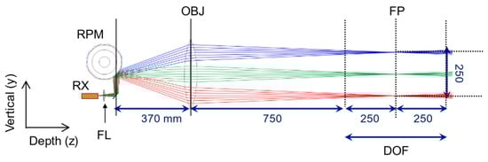 The reflected or scattered beam from the target passes through the BS, and enters the telecentric objective lens (OBJ) and the Rx through the 8-plane rotating polygon mirror (RPM) and focusing lens (FL). The telecentric OBJ is particularly important in this optical design. The introduction of the lens ensures that the main beam is often parallel to the optical axis of the lens even when the receiving beam is scanned in the vertical direction, enabling the acquisition of 3D images without depth-dependent lateral distortion. All lenses used on these optics were made of high-density polyethylene (HDPE).