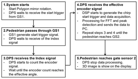 In this system, measurements were automatically taken while the pedestrian passed through GS1 and GS2, and finally, a 3D image was displayed on the display. These series of signal processing were controlled using a field-programmable gate array (FPGA)-based real-time data processing system (DPS) developed by 3D Innovation Co. Ltd., Sendai, Japan. Figure 7 and Figure 8 show the wiring diagram and measurement flowchart, respectively. When the GS1 detects the passage of a pedestrian, a start trigger is sent to the DPS. Triggered by this signal, the DPS starts acquiring the rotation encoder and index signals from the motor driver of the polygon mirror scanner. Based on the encoder signal, it sends a frequency-sweep start trigger to the synthesizer and acquires the IF signal output from the transceiver. This series of frequency sweep and data acquisition continues until the pedestrian passes GS2 and the DPS receives a stop trigger. Until the completion of this passage, the DPS automatically extracts the reflection intensity and depth information by performing fast Fourier transform (FFT) processing based on the FM-CW radar principle and transfers the results to a PC through the ethernet with parallel processing.