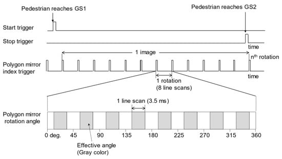 Figure 9 shows the timing chart of the trigger signals from GS1 and GS2, the polygon mirror index trigger, and mirror rotation angle when passing through GS1 and GS2. The polygon mirror motor driver generates an index signal for every revolution and an encoder signal every 0.1125°. During the measurement, the polygon mirror rotates 20–30 times depending on the walking speed, and the number of rotations is shown as nth in the figure. The bottom row shows the angle of rotation of the polygon mirror, and the gray area is when the DPS performs the radar measurements. This corresponds to when the RX can detect the beam passing through the telecentric lens from the target side using the polygon mirror. Thus, as aforementioned, 50% of the actual measurement time is available for data acquisition.