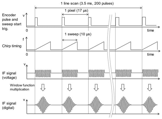 Figure 10 shows a timing chart during one vertical scan period, corresponding to one gray area in the bottom row in Figure 9. The top row is the chart for the encoder pulse and sweep start trigger, demonstrating the same waveform. As the DPS constructs one pixel for each pulse of the encoder signal, it takes 3.4 ms to measure one line consisting of 200 pixels. The second row shows the slope of the frequency sweep from 275 to 305 GHz. The sweep duration is 10 µs, and the following 7 µs are used for zero-filling and data processing, during which the frequency sweep is stopped. The third row is the waveform of the IF signal digitized by a 14-bit A/D converter (AD9680, Analog Devices Inc., Wilmington, NC, USA) with a concatenated zero value. This dataset consists of 2500 point IF signals followed by 1596 zero value points, for a total of 4096 data points. The zero-filled IF signal data are finally multiplied by the window function as shown in the fourth row in the figure, and FFT processing is performed in parallel with data acquisition to convert it into a range (depth) profile consisting of 2048 points. According to Nyquist’s theorem, the maximum frequency of the spectrum is 125 MHz, corresponding to 12.5 m in terms of optical path length.