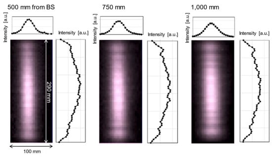 First, the measurement results of the illuminated beams were evaluated. Figure 11 shows the beam profiles measured at positions 500 mm, 750 mm, and 1000 mm from the BS. The measurements were performed by obtaining the intensity distributions by scanning a DLATGS (Deuterated L-Alanine Triglycine Sulfate) pyroelectric detector with the detection area of 3 mm in diameter. As can be seen from them, the beam sizes were 255–260 mm (FWHM) in the vertical direction and 38–46 mm (FWHM) in the horizontal one. Thus, the beam shapes were almost identical to each other, and we confirmed that the collimated beam along with the optical design was realized.