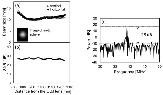 Next, to evaluate the relationship between depth position and detection sensitivity, the signal-to-noise ratio (SNR) was measured. Figure 12b shows the plot of the SNR along the optical axis when a metal sphere was used as the target. The maximum SNR was measured near the beam waist, and it slightly decreased with increasing distance from the waist; however, the decrease was less than 3 dB. Figure 12c shows the range profile when a metal sphere was placed near the focal point, and the SNR was defined as the ratio of the peak height to the noise floor. The maximum SNR was 28 dB observed near the focal point.