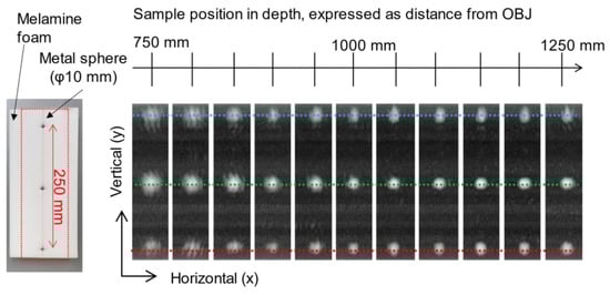 In 3D imaging, the depth-dependent lateral distortion affects the reproducibility of 3D image reconstruction. To evaluate this effect, the images obtained at each depth position were compared. As shown in the photograph in Figure 13, a target consisting of three metal spheres 10 mm in diameter equally spaced vertically was used. The target was moved from 750 mm from the objective lens in 50 mm increments, and the image measurements were taken. For vertical scanning, the detection spot was scanned by rotating the polygon mirror, while the horizontal scanning was performed by placing the sample on a single-axis automated stage.