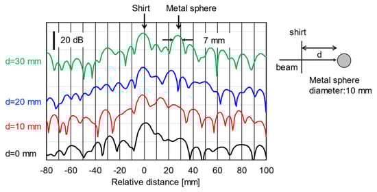 Next, we evaluated depth resolution, one of the most important parameters related to the detection performance of concealed objects. In this measurement, a shirt was stretched flat, and a metal sphere 10 mm in diameter was placed behind it. The target was placed at a distance of 1 m from the OBJ and the range profiles were measured by moving the distance between the shirt and the sphere by 30 mm in 10 mm increments from 0 mm. The depth resolution was defined as the FWHM of the peak at which the shirt and sphere could be separated by the radar. Figure 14 shows the range profiles obtained at different distances between the shirt and the sphere. The FWHM of the peak from the reflected signal from the sphere was 7 mm as shown in the figure, approximately 40% larger than the resolution calculated from the FM-CW principle.