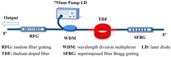 A schematic diagram of the proposed triple-wavelength TDF random laser is shown in Figure 1. A 1.2 m-long double-cladding TDF (Nufern, SM-TDF-10P/130-HE) was pumped by a 793 nm laser diode (LD) through a 793/2000 nm wavelength division multiplexer (WDM). The RFG was fusion spliced to the signal port of the WDM to provide random distributed feedback and the SFBG was connected to the end of the TDF to reflect the selected wavelengths. The laser output was guided out from the left end of the RFG. Both ends of the RFL fibers were fusion spliced to angle-polished connectors to avoid Fresnel reflections from the fiber ends. The mode field diameter, numerical aperture and the absorption coefficient at 793 nm of the TDF were 10 μm, 0.15 and 3.6 dB/m, respectively.