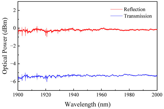 The RFG used in this work was 10 cm long with ~6000 randomly spaced refractive index modulation points, which were inscribed point-by-point in a SMF along the length of the fiber using a Ti:Sapphire laser operating at 800 nm with a repetition frequency of 100 Hz and pulse duration of 80 fs [22]. The modulation points enhance the non-uniformity of the refractive index and lead to strong backward Rayleigh scattering in the SMF [34]. Figure 2 shows the measured reflection and transmission spectra of the RFG. Since the grating period was randomly distributed, there was no obvious reflection peak or transmission dip observed, except for several absorption lines of water molecules that could not be removed from the measurement. The measured power level of the reflection spectrum was ~5.2 dB higher than that of the transmission one because it was amplified before measurement. The power level before amplification was too low due to the relatively low level of the source power and the high insertion losses of the RFG, 5.3 ± 0.2 dB, and fusion splice points, ~2 dB, in the range of 1940 to 1950 nm.