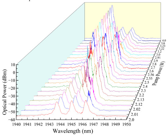 When the pump power was further increased, the intensity of the laser peak at 1946.3 nm started to decrease, while the intensity of the other two peaks at 1943.6 and 1945.0 nm kept increasing. The laser peak at 1945.0 nm reached the maximum intensity at a pump power of 2.8 W. Conversely, the output lasing peak at 1946.3 nm became quite low and separated into several random narrow spikes at a pump power of 2.9 W. The spikes disappeared when the pump power was further increased to 2.91 W, leaving only the smooth reflection peak of the SFBG at 1946.3 nm. When the pump power was increased further, the laser peak at 1945.0 nm gradually decreased and then separated into narrow spikes, and disappeared when the pump power increased to 3.23 W. Only the lasing peak at the shortest wavelength of 1943.6 nm continued to grow when the pump power was increased from 3.23 W to 4.0 W. The other two peaks shrank during this phase.
