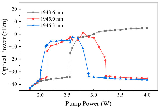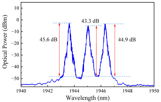 Some discrete random narrow spikes appeared at around 1945.0 nm and then at around 1943.6 nm when the pump power was increased to 2.13 and 2.56 W, respectively. Their evolutions with increasing pump power were the same as those generated at the first lasing peak of 1946.3 nm. They were gradually broadened and superposed to form two relatively stable and smooth peaks at higher pump powers. At the same time, the optical power of the formed smooth laser peak increased gradually with pump power. When the pump power reached 2.7 W, the three lasing peaks were observed simultaneously at 1943.6, 1945.0 and 1946.3 nm, respectively. The measured laser spectrum is shown in Figure 6. The 3 dB linewidths were 0.081, 0.099, and 0.083 nm, respectively, and the OSNRs for the lasing peaks were 45.6, 43.3 and 44.9 dB, respectively.