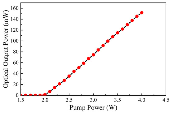 Figure 7 shows the measured laser output power vs. pump power. It can be seen that the output power increased linearly with the pump power once it exceeded the threshold of 2.01 W. The laser achieved a maximum output power of 151.8 mW at a pump power of 4.0 W. The slope efficiency was 7.86%. Compared with the previously reported TDF random laser using a 200 m-long SMF as the random distributed feedback media, our laser gave the close slope efficiency but much lower threshold power, ~57% of that in [29].