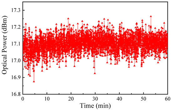 To test the stability of the triple-wavelength RFL achieved at a pump power of 2.7 W, we measured the RFL’s output spectra every 5 min using the OSA and recorded the laser output power once per second using the OPM within a one-hour period. Figure 8 and Figure 9 show the measured results for peak wavelengths and laser output power vs. time, respectively. It can be seen that the laser peak wavelengths were very stable with a maximum wavelength shift of 0.08 nm. The measured laser output power was 17.07 0.20 dBm.