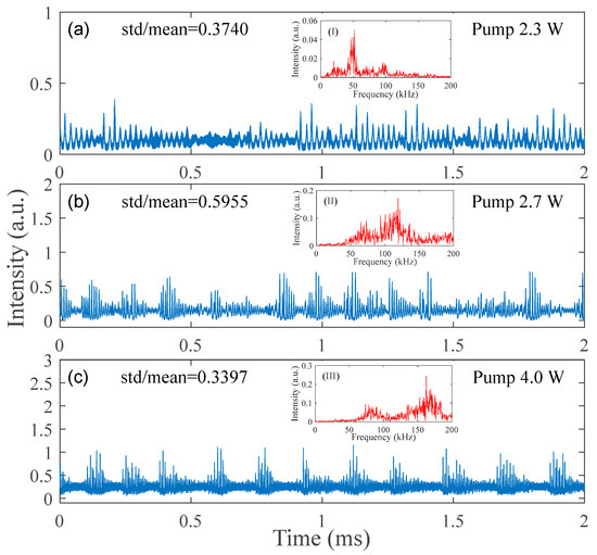 In order to investigate the temporal characteristics of the RFL lasing output, we recorded the time-domain traces using the 25 MHz photodetector and the oscilloscope and used the value of the std/mean (standard deviation divided by mean) to characterize the time dynamics. The measured results are shown in Figure 10. When the pump power exceeded the lasing threshold, many random self-pulsing phenomena with different peak intensities were observed with a std/mean value of 0.3740. The random self-pulsing phenomena with different intensities may be caused by relaxation oscillations and excited-state absorption of the active fiber under nonuniform pumping [43,44,45]. Under continuous pumping, the gain and the Q-value of the cavity were recurrently driven up and down by the stimulated Brillouin scattering process [28], and the peak amplitude and repetition rate of these random self-pulsing became larger with increasing pump power. The three insets I, II and III in Figure 10 show the Fourier transform spectra of the three time-domain traces. It can be seen that the dominant repetition rates were ~52, 119 and 162.5 kHz at pump powers of 2.3, 2.7 and 4 W, respectively, though the frequency components were complex. When the pump power was sufficient to indirectly saturate the level of absorption, a continuous train of pulses or oscillations generated by the saturation absorption could be dampened [46], thus only some periodic pulse clusters were observed in Figure 10b,c. The modulation rates were about 7 and 6 kHz in these two cases. The std/mean between the self-pulsing intensity became smaller when the pump power was 4.0 W compared to that of 2.7 W. This may also be related to the reduction in the number of lasing peaks as there must be a large number of spatially overlapping lasing modes in each laser peak.