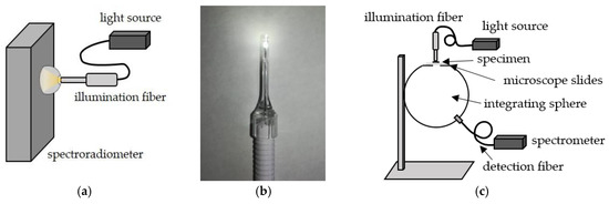 (a) Set-up for luminous flux measurement. The emitted light from the illumination fiber entered the aperture of the integrating sphere of the spectroradiometer. (b) Diaphanoscopic illumination fiber with scleral depressor. (c) Set-up for transmission measurement. The light from the diaphanoscopic illumination fiber was transmitted through the eyewall into the integrating sphere, which is connected to a spectrometer.