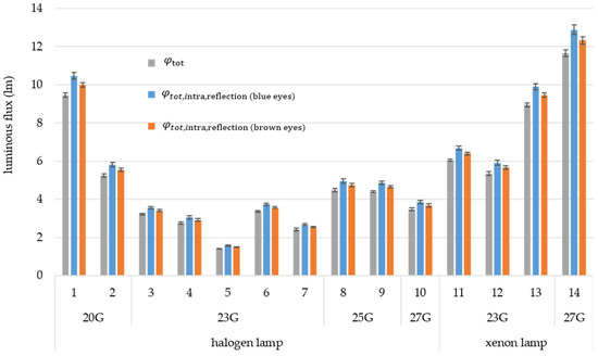 The total luminous flux emitted by different ophthalmic illumination fibers (#1–14 and Table 1) and the intraocular luminous flux are given in Figure 2. Depending on the type of fiber, the diameter of the fiber (20–27G) and the light source, (gray bars) vary a lot and range between 1.43 and 11.66 lm inside the eye. The intraocular luminous flux, , in blue and brown eyes (blue and orange bar, respectively) is slightly higher due to the reflection properties of the inner side of the eyewall. Since the reflection in blue eyes is higher than in brown eyes [24], the intraocular luminous flux is also higher in blue than in brown eyes.