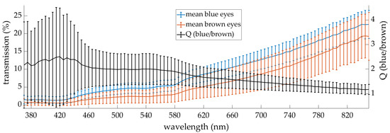 Wavelength-dependent transmission of the porcine eyewall depending on the pigmentation of the eye on the left y-axis and the ratio Q of the transmission of blue eyes to that of brown eyes on the right y-axis with corresponding standard deviation.