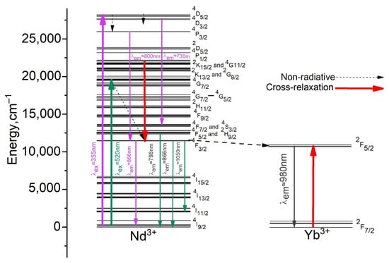 Particularly, under 355 nm excitation (4I9/2–4D5/2 absorption band of Nd3+) the 4F3/2 level of Nd3+ in populated via cross-relaxation (2F7/2–2F5/2 (Yb3+) and 2K15/2–4F3/2 (Nd3+)), radiative and nonradiative transitions from the higher energy levels. In turn, excitation at 520 nm (4I9/2–2K13/2/2G9/2 absorption band of Nd3+) excluded cross-relaxation process. Indeed, in order to confirm the presence of radiative and nonradiative transitions, we detected the luminescence spectrum of Nd3+ (0.3 mol.%) Yb3+ (2 mol.%):LiYF4 phosphors in the slightly broader (spectral range 710–1100 nm) spectral range under 355 nm excitation (Figure 3). According to the literature data [5], there were two peaks at ~740 and 800 nm that were interpreted as transitions from the upper 4D5/2 and 4P3/2 levels to 4FJ of Nd3+. Hence, the 4FJ levels were populated via these radiative transitions. The nonradiative transitions between the 4FJ levels were also possible and the population of the lowest 4F3/2 level could also be nonradiative (for example from 4F7/2).