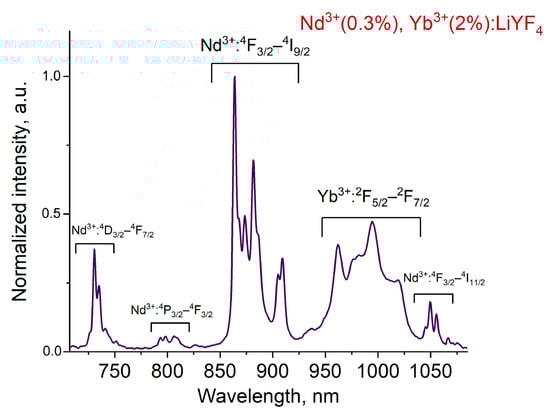 The room temperature spectrum of Nd3+ (0.3%), Yb3+ (2.0%): LiYF4 phosphors normalized at 866 nm. The excitation λex = 355 nm corresponds to 4I9/2–4D5/2 of Nd3+ absorption band. The spectrum illustrates the presence of 4D5/2, 4P3/2–4FJ transitions.