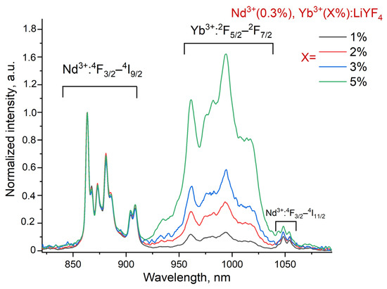 Normalized luminescence spectra of Nd3+ (0.3%), Yb3+ (1.0–5.0 mol.%):LiYF4 phosphors detected at room temperature are shown in Figure 4. Excitation of the system was carried out at λex = 520 nm, (2K13/2–2G9/2, absorption band of Nd3+ ions). The observed Yb3+ luminescence indicates the energy transfer from Nd3+ to Yb3+. All peaks were identified as the transitions from 4F3/2 (Nd3+) and 2F5/2 (Yb3+) to the lower energy levels. The peaks had a complex structure because of the complicated Stark structure of the electron levels. The emission intensity of Yb3+ rises with the increase in Yb3+ concentration compared to Nd3+ emission intensity. These processes of the energy transfer involve 4F3/2 (Nd3+) and 2F5/2 (Yb3+).