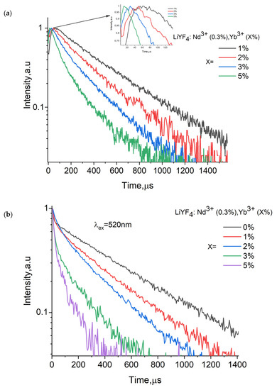 According to ref. [18], the energy transfer between doping ions can be described by a process characterized by its probabilities. Energy exchange process between Nd3+ ions seemed to be also probable; however, the Nd3+ (0.3 mol.%) concentration for the studied samples did not change, its effect on the studied temperature-dependent luminescent properties was assumed to be negligible. Additionally, in ref [19,23], a cross-relaxation process was proposed for the Nd3+/Yb3+ pair. This process involves the Nd3+ (2K15/2/4G11/2–4F3/2) and Yb3+ (2F7/2–2F5/2) transitions. The room temperature luminescence decay curves of the 4F3/2–4I9/2 transition (866 nm) of Nd3+ under 355 nm excitation are shown in Figure 5a.