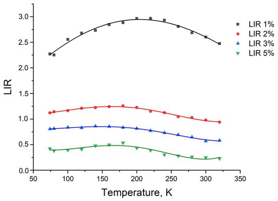 The LIR dependences are presented in Figure 7. It is clearly seen that the shape of the LIR functions demonstrated weak dependence on the concentration of Yb3+ at a constant 0.3 mol.% of Nd3+. The LIR function had complex temperature dependence with segments of an increase in the range of 77–220 K, as well as a decrease character in the range of 230–320 K. This dependence was most pronounced for 1 mol.% Yb3+. Based on the fact that the nature of the change in the LIR function also depended on the processes of energy transfer between two ions, there is a possibility that cross-relaxation influenced the character of the change in the LIR curves. The LIR functions of the Nd3+ (0.3%), Yb3+ (1.0–5.0 mol.%):LiYF4 samples had complicated shape with growth part in the temperature range of 75–200 K and a decay part in the temperature range of 200–320 K. The growing character of the LIR function takes place because Nd3+ intensity increases faster that Yb3+ one with temperature. It occurred because the phonon appearance probability is relatively low in this temperature range. Then, this probability increased and the population of 2F5/2 level of Yb3+ happened more efficiently and the intensity of Yb3+ started to grow, in turn the efficiency of depopulation of 4F3/2 level of Nd3+ also increased and INd/IYb started to decay with the temperature increase. Figure 8 shows the LIR curves at different excitation wavelengths of 355 and 520 nm for the sample Nd3+ (0.3%), Yb3+ (2%): LiYF4. As we can see in the Figure 8, the shape of the LIR curves as a function of temperature is independent of excitation wavelengths. To quantitatively compare both functions, we represented the parameters of fitting procedure in Table S1 of Supplementary File. The parameters are very close to each other. This may tell us that the population of the Yb3+ level due to the cross-relaxation process does not notably affect the temperature sensitivity and the efficiency of cross-relaxation does not depend on temperature. However, it is worth considering that the same LIR value was achieved for two different temperatures for 120 and 280 K. It is worth considering that temperature measurement for this class of substances was possible from 200 K., which is suitable for measurements in fundamental biology, circuitry, etc. [25].