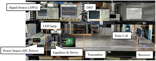 The bandwidth expansion performance test system is shown in Figure 5. In the experiment, an arbitrary waveform generator (AWG, Keysight 33600A) was used as the signal source, and it send signals to the equalization circuit and drive circuit. The equalizer and driver were printed in one PCB. A commercial high-power fluorescent white LED lamp was used as the light source, with electric power of 15 W, working current of 300 mA and a general rendering index of 90. The communication distance was 1.5 m. A CdTe solar cell (164 × 133 × 3.2 mm) was used as the detector, and an illumination meter (TES-1339) measured the average illumination at the receiver of 600 lx. The received signal waveform was observed using a Digital Storage Oscilloscope (DSO, Keysight DSOS204A). The amplitude of the signal was 200 mV, and the digital oscilloscope was set to AC coupling. The used transistor is a typical NPN transistor SS8050. The used MOSFET in the driver was model BSP297. was 5 V which was provided by DC power supply in the equalizer circuit, , , , , and , and all the test operations were under those parameters.