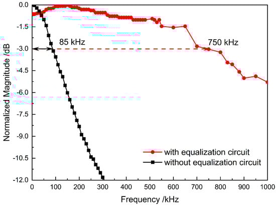 The amplitude–frequency response of the transmitter compensated for the amplitude–frequency response of the receiver within the cutoff frequency of the system in Figure 7. In addition, the figure used a relative representation to show the result more clearly.