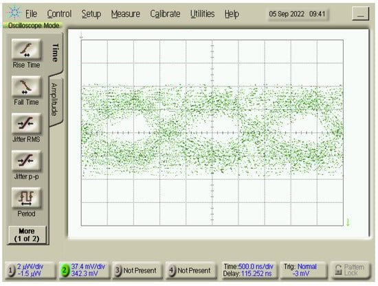 The eye diagram with 600 kbps pseudo-random sequence is shown in Figure 8. It shows that the system with the equalization circuit can achieve that data rate. The amplitude–frequency response of this system decreased slowly after 750 kHz, which means that higher order equalization circuits could be used to expand the bandwidth further. However, the complexity of the system will be increased. That means there is a trade-off between expanding the bandwidth range and system complexity. It is significant to select an appropriate equalization circuit structure and the corresponding component parameters according to the application demand.