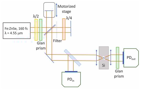 In the experiments, the radiation of an Fe:ZnSe laser system (central wavelength of 4.6 µm, pulse duration of 160 fs (FWHM), repetition rate of 10 Hz) was used. For estimating the deposited energy density, we used an experimental setup similar to that described in [26] (see Figure 1). The incoming laser pulse was focused inside a Si sample (2 × 2 × 2 mm high, Tydex Ltd., St. Petersburg, Russia) by a reflective objective (LMM40X-P01, Thorlabs, Newton, USA) with NA = 0.5. The transmitted laser radiation was collimated by an aspheric lens (390037-E, Thorlabs) with NA = 0.85. The sample was mounted onto a motorized XYZ stage (8MT184, Standa, Vilnius, Lithuania) and was shifted from pulse to pulse with a 2.5 μm step. The incoming (Ein) and transmitted (Eout) energies were monitored by a pair of calibrated amplified PbSe photodetectors (PDA20H, Thorlabs). The input and output energies were controlled simultaneously. The laser pulse energy was varied by a half-wave plate and polarizer (WP12LM-IRA, Thorlabs). We obtained the transmitted energy for different input energies, as shown in Figure 2a. The volume of the microplasma was monitored by obtaining its luminescence, as described in [27], using a CCD camera (MindVision ME-GE130GMT). Si has several atomic lines in the near-IR range (1100–1300 nm) and the intensity of their luminescence (1203, 1210, and 1229 nm lines) is proportional to the electron concentration [27]. Therefore, the area where the microplasma is generated can be obtained through microscopy. The deposited energy density (DED = Eabs/Vplasma) is the ratio of the absorbed energy (Eabs = Ein − Eout) to the microplasma volume [8]. Therefore, DED can be calculated by measuring the absorbed energy and plasma volume.