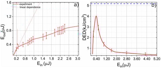 In the first series of experiments, we measured the plasma-generation threshold, absorbed energy, and deposited energy density (DED). We simultaneously monitored the input and transmitted energy while varying the laser pulse energy, as shown in Figure 2a. At low energies, there was no absorption, because the microplasma was not generated. When the laser pulse energy surpassed the threshold (~250 nJ), the dependence of the transmitted energy on the input energy deviated from linear because the microplasma started to absorb the laser pulse energy (see Figure 2a). We also calculated the DED for a wide range of laser pulse energies, as presented in Figure 2b. The DED was close to zero at energies lower than the threshold because there was no absorption. However, the DED began growing after surpassing the threshold. Initially, the absorbed energy increased faster than the plasma volume; however, by increasing the electron concentration and plasma volume, the microplasma “clamps” the intensity in the focal plane and the DED decreased [8]. The maximum DED was achieved at about 1.6 Eth (Eth is the plasma-formation threshold). At these energy levels, plasma defocusing was not a dominant process and we could efficiently deliver energy to the atomic subsystem from the electronic subsystem [11]. It is important to note that the DED was averaged over the whole microplasma volume and the peak values could be higher. However, the observed DED was lower than the threshold value of micromodification formation and no micromodifications were obtained afterward.