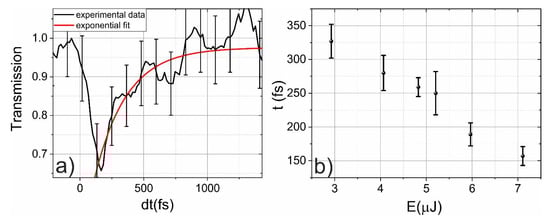 Before the impact of the pump pulse, the transmission was 100%. Then, it rapidly dropped on the laser-pulse-duration timescale (~150 fs) and reached a level of ~65%. Then, the relaxation of the microplasma began. We fit the dynamics of relaxation with an exponential function (1 − (exp(−t/τ))), where τ is the plasma-relaxation time. The dependence of the plasma-relaxation time on the laser pulse energy is presented in Figure 3b. According to [23], the relaxation time of hot electrons in silicon heavily depends on their energy, and electrons with higher energies relax faster. For example, the relaxation time for 3 eV electrons is about 30 fs. This is illustrated in Figure 3b, where the relaxation times of electron plasma decreased from 320 fs in the case of a 3 μJ laser pulse to 160 fs in the case of a 7 μJ laser pulse. It is important to note that in our experiment in the time domain, we were limited by the pulse duration so the relaxation time could be lower than 160 fs.