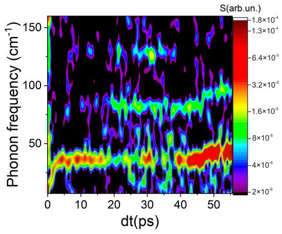 In the last series of experiments, we retrieved the long-term dynamics of the coherent phonons. This was carried out in an experimental setup similar to the setup used to analyze the dynamics of coherent phonons in transparent dielectrics [31]. In this experiment, a signal of the third harmonic generated by a probe pulse on coherent phonons was recorded, similar to our previous work [20]. By varying the delay between the pump and probe pulses due to the movement of one of the arms in the Michelson interferometer, oscillations were observed in the third harmonic signal. The evolution of the phonon spectrum in silicon was obtained under excitation of the mid-IR laser pulses (see Figure 4) by analyzing this time signal using Fourier analysis with a floating time window.