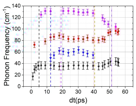By analyzing the dynamics of the spectrum of coherent phonons, it was possible to determine the characteristic times of changes in the phonon spectrum. In Figure 5, these times are marked with vertical dashed lines. The phase transition from the Imma phase to β-Sn can be easily identified by a smooth disappearance of phonons at a frequency of 130 cm−1, as well as an increase in the phonon frequency from 80 cm−1, which is characteristic of the Imma phase [36], to 100 cm−1, which is characteristic of the β-Sn phase [37]. A similar frequency jump under a pressure variation was noted in [38]. It can also be stated that frequencies in the region of 30 cm−1 are characteristic of the fcc phase, as noted in [36]. In the same work, it was demonstrated that frequencies in the region of 70 cm−1 are characteristic of the cubic phase [36].