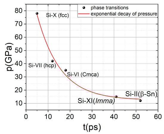 However, to identify new phases in silicon, one should pay attention to the time delays when the changes in the phonon spectrum occurred. Because the pressures at which the phase transitions occurred were relatively well-defined, at least for stationary conditions [33], and the pressure at the shock wave front decayed exponentially [39], it was possible to plot the points on axes (time—pressure), where the x-axis represented the delay at which the phase transitions occurred, and the y-axis represented the pressure at which the phase transitions should have occurred. If these points formed an exponential relationship (pressure decay), then the phase change was correctly restored. Figure 6 shows this graph, demonstrating that all points correspond accurately to the exponential decay of pressure. Thus, we can conclude that the shock wave induced by a laser pulse in silicon leads to a cascade of phase transitions and that they occur with decreasing pressure.