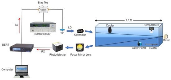 The experiment scheme consists of the transmitter, medium, and receiver. At the transmitter side, a current driver (ILX Lightwave LDC3722, ILX Lightwave Corporation, Bozeman, US) drove the current to the blue laser diode (OSRAM PL450 TO-38, OSRAM Licht AG, Munich, Germany). The laser diode (LD) used collimation to focus the light and a cooler to control the laser temperature. The light was transmitted through a 1.5 m × 0.3 m × 0.3 m size water tank. Secondly, the medium was seawater with different types of salinity. The heater, fan, and water pump were placed inside the tank to vary the temperature and water condition. A digital thermometer showed the temperature measurement inside the water tank. Then, an optical mirror reflected the laser beam and expanded the transmission distance to 3 m. In the receiver part, the focus mirror lens and avalanche photodiode (APD 210, Menlo System GmbH, Martinsried, Germany) were used to receive the laser beam. Then, the information signal was evaluated using a bit error rate test (BERT). The modulation in this experiment used NRZ-OOK. This experiment used a pseudorandom binary sequence 7 with a repetition period of 127 values. The equation can be found in N = 2k − 1, where ‘k’ indicates the size of random data for each sequence. For a maximum length sequence, where N = 2k − 1, the duty cycle is ½. A bias tee was used to superimpose a modulation current onto the laser diode DC-supply current, thereby modulating the output power of the laser. The modulation speed was 1.25 Gbps, and the signal generator could modulate up to 2.5 Gbps. Due to limitations in our laboratory, the APD frequency could only receive modulations up to 1.25 Gbps. In the demodulation part, we used a Photodetector (Menlo System GmbH, Martinsried, Germany) APD 210 to change the optical signal to an electrical signal. The BERT measurement was used to compare the modulated signal transmitted and the demodulated signal received by the photodetector. The relationship between salinity, mass, and volume is shown in the equation below: