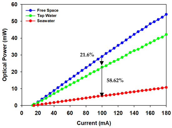 In this experiment, a 450 nm blue-light laser beam was transmitted in different mediums, such as free space, tap water, and seawater. The different refractive indexes caused the scintillation of the focused laser beam, which caused signal fading and beam wandering in the transmission channel. This experiment was measured at a 1.5 m distance. The distance measurement of 1.5 m was used to compare measurements of the UWOC system in tap water, seawater, and free space with no additional loss from the mirror. The threshold current was around 15 mA using OSRAM PL-450B. As shown in Figure 3, when the blue LD had a typical drive current of 100 mA, the optical power of tap water decreased by about 21.6% compared to the free space medium. In 45.56 g/L of saline water, the laser optical power was reduced by approximately 58.62% compared to the tap water. The optical power decreased by about 80.22% in total because of the different mediums of seawater. Some of the factors involved in attenuating laser optical power were the transmission distance, the wavelength used in the UWOC system, and the different refractive indexes in the air and water.